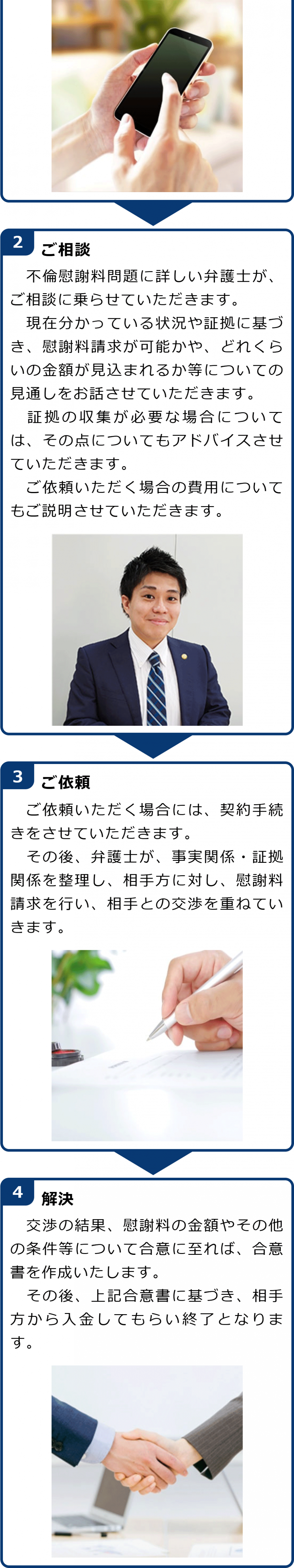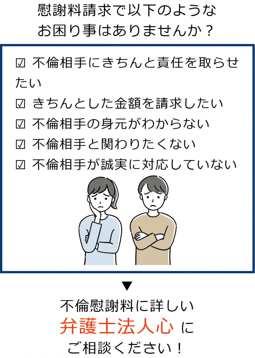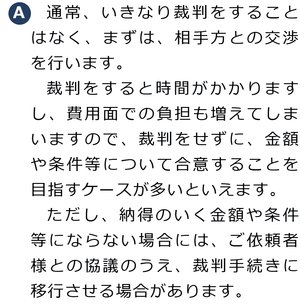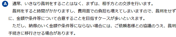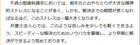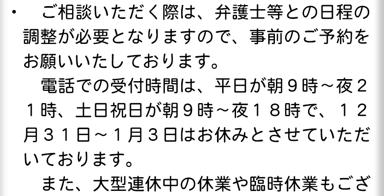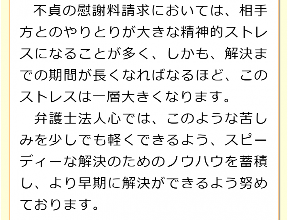 不倫慰謝料請求でお困りの方へ 閉じる 閉じる よくあるご質問 お問合せから解決までの流れ 受付時間 平日 9時~21時、土日祝 9時~18時夜間・土日祝の相談も対応します(要予約) 所在地 〒286-0033 千葉県成田市花崎町801-1京阪成田ビル6F (千葉県弁護士会) 0120-41-2403 お問合せ・アクセス・地図